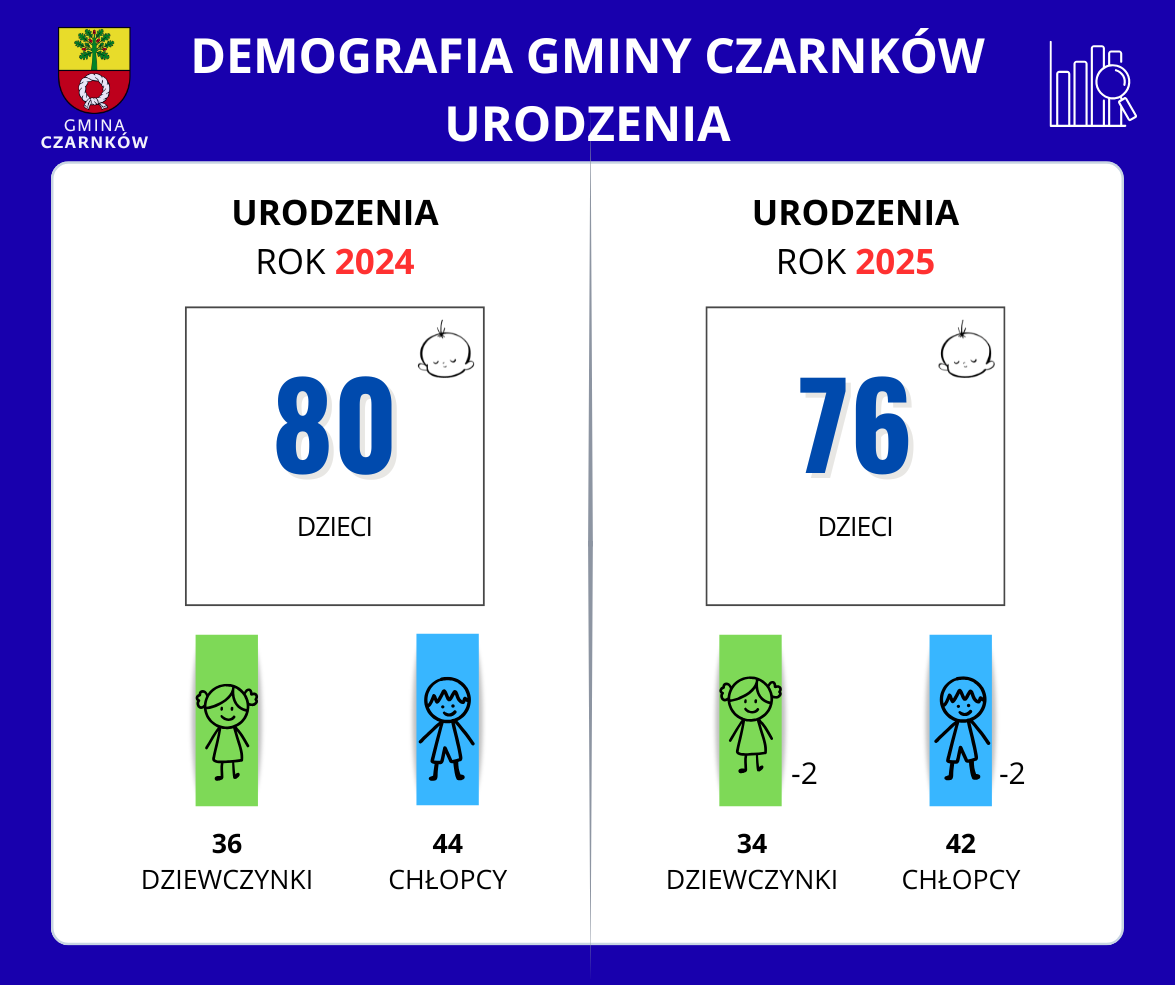 W 2025 roku urodziło się 76 dzieci (w tym: 34 dziewczynki i 42 chłopców). Oto liczby urodzeń w poszczególnych miejscowościach: