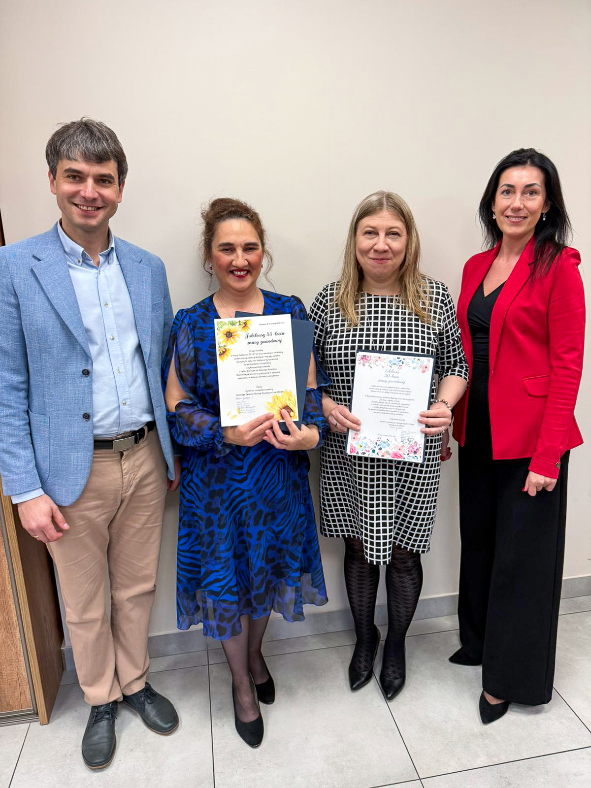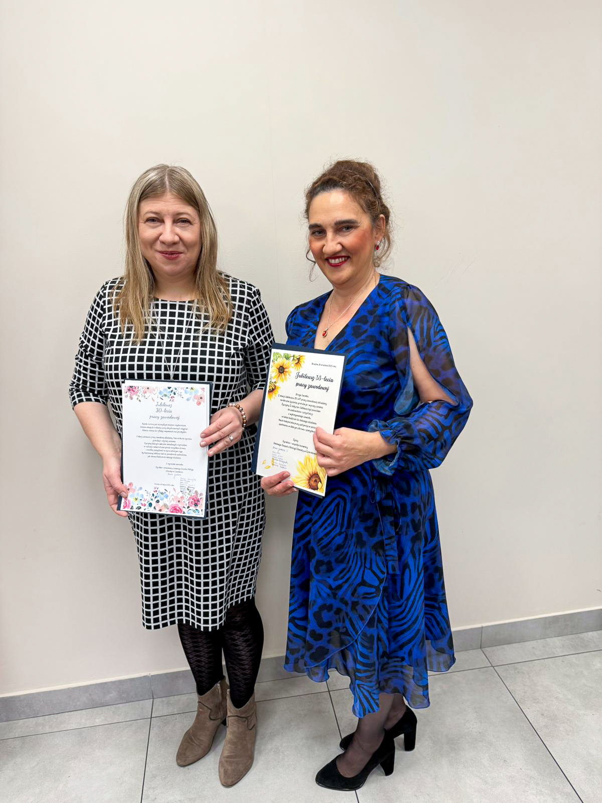 W Gminnym Zespole Obsługi Oświaty w Czarnkowie mieliśmy powód — a nawet dwa — do świętowania. Iwona Stochaj, Inspektor ds. rozliczeń ogólnych, obchodziła 35-lecie pracy zawodowej, a Agnieszka Andrzejewska, Inspektor ds. księgowości budżetowej, świętowała 30-lecie.