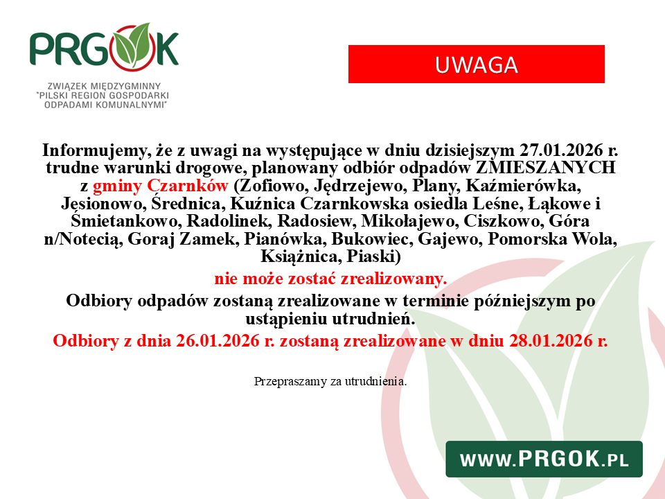 Mamy też ważną wiadomość dla osób u których odbiór nie odbył się wczoraj 26 stycznia. Te odpady zostaną odebrane jutro czyli 28 stycznia. Odbiory zaplanowane na dzisiaj zostaną wykonane w najbliższym możliwym terminie.