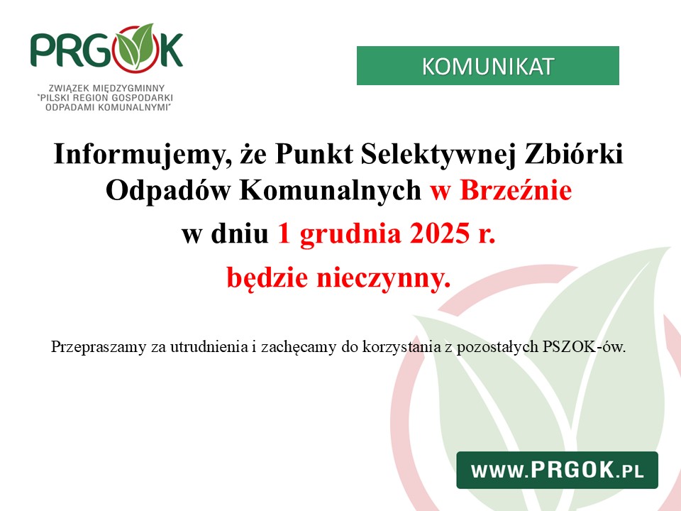 28.11.2025 Powrót Punkt Selektywnej Zbiórki Odpadów Komunalnych w Brzeźnie (PSZOK), będzie nieczynny w poniedziałek 1.12.2025 r. Udostępnij: FacebookDrukujPDF Polecane artykuły 01.12.2025 Punkt Selektywnej Zbiórki Odpadów Komunalnych w Brzeźnie (PSZOK), będzie nieczynny w poniedziałek 1.12.2025 r. 26.11.2025 Gmina Czarnków z kolejnym rządowym dofinansowaniem! 26.11.2025 Pomoc dla pogorzelców z Zofiowa Wszystkie aktualności Archiwum aktualności
