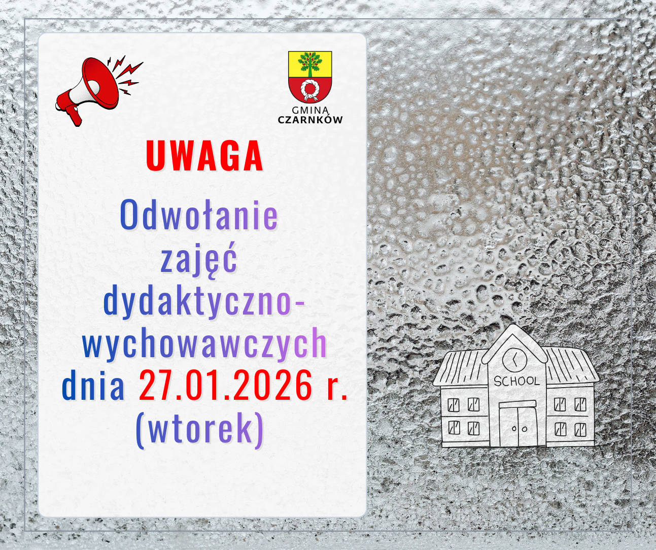 W związku z bardzo trudnymi warunkami pogodowymi informujemy, że w dniu 27 stycznia (wtorek) zajęcia dydaktyczno-wychowawcze oraz pozalekcyjne na terenie gminy Czarnków zostają odwołane.