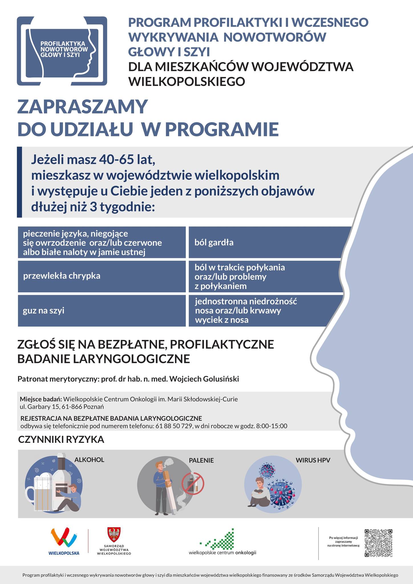 Mamy w Wielkopolsce wyjątkową okazję, bo jako jedyni w kraju możemy skorzystać z darmowego programu profilaktyki nowotworów głowy i szyi. Warto skorzystać z tej szansy i sprawdzić swoje zdrowie, aby zyskać pewność i spokój na przyszłość.