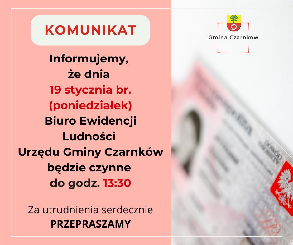 Informujemy, że dnia 19 stycznia br. (poniedziałek) Biuro Ewidencji Ludności Urzędu Gminy Czarnków będzie czynne do godz. 13:30.