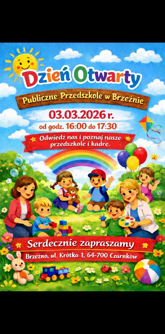 Publiczne Przedszkole w Brzeźnie zaprasza przyszłych przedszkolaków wraz z rodzicami na Dzień Otwarty. To idealna okazja, aby odwiedzić placówkę, poczuć jej atmosferę oraz poznać kadrę pedagogiczną.