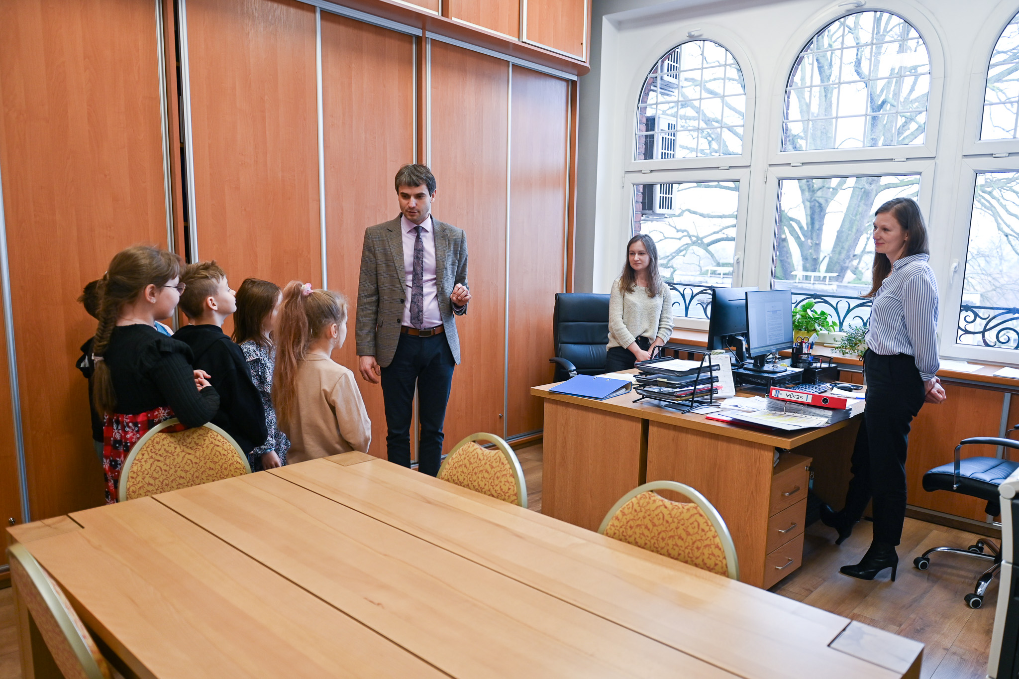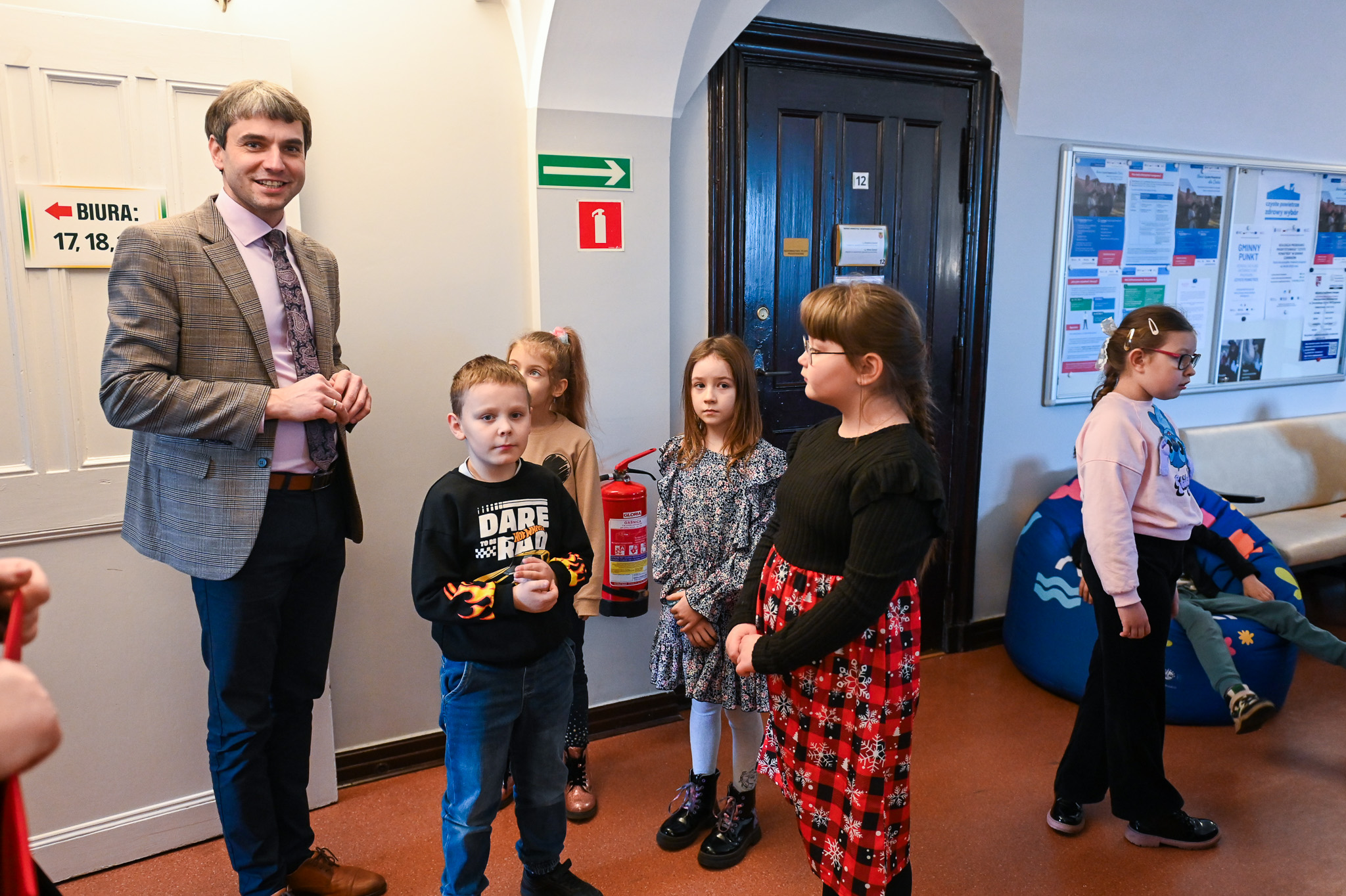 W ramach podziękowania Wójt Gminy Czarnków, Krzysztof Chyży, osobiście oprowadził dzieci ze Śmieszkowa po urzędzie. Odwiedzili nie tylko korytarze, ale i poszczególne pokoje, gdzie dzieci z bliska przyglądały się pracy urzędników. Młodzi słuchacze z wielkim zaciekawieniem poznawali informacje na temat budowy nowych placów zabaw i dróg.Miały także okazję pouczyć się geografii i samodzielnie odszukać swojej miejscowości na dużych mapach.