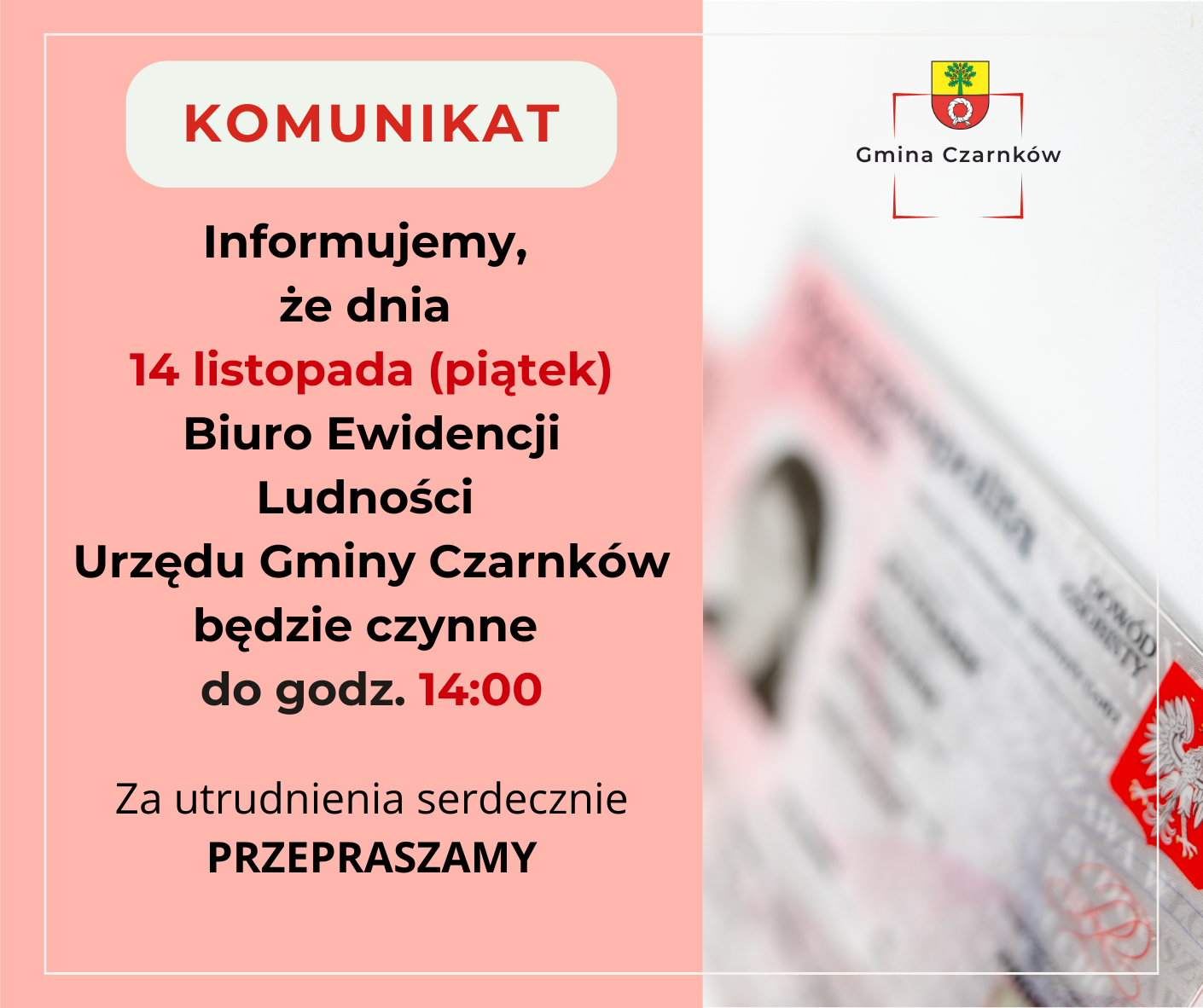 Informujemy, że dnia 14 listopada (piątek) Biuro Ewidencji Ludności Urzędu Gminy Czarnków będzie czynne do godz. 14:00.