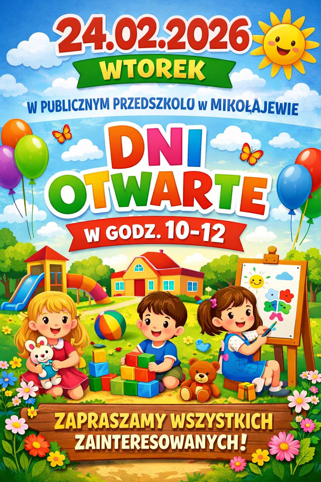 Już 24 lutego (wtorek) w godz. 10:00–12:00 zapraszamy Was na Dni Otwarte w Publicznym Przedszkolu w Mikołajewie!