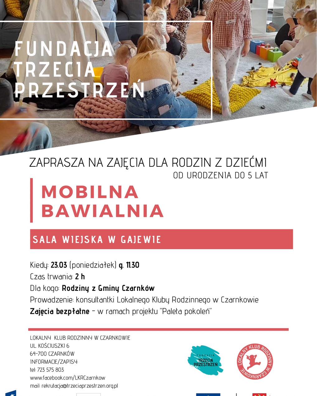 Lokalny Klub Rodzinny zaprasza wszystkie rodziny z dziećmi od urodzenia do 5 roku życia z Gminy Czarnków na MOBILNĄ BAWIALNIĘ do Gajewa.